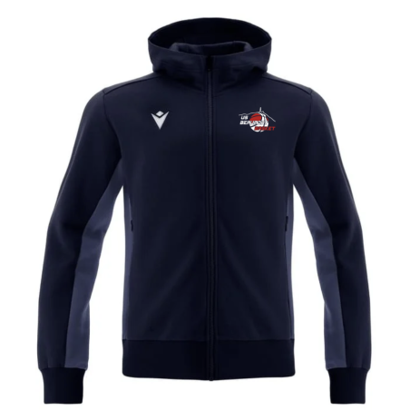 Sweat de loisir en polycoton molletonné avec fermeture à glissière centrale complète moulée sous pression. Poignets et bas côtelés. Poches latérales à fermeture à glissière et tirette en caoutchouc avec Macron Hero. Empiècements ton sur ton sur les côtés et sous les manches.